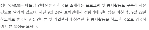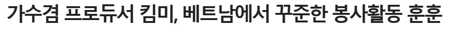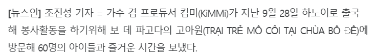 [[기사]](뉴스in) 가수겸 프로듀서 킴미, 베트남에서 꾸준한 봉사활동 훈훈 작성자TigerLily_KiMMi|작성시간23.12.25|조회수37 목록 댓글 0 글자크기 작게가 글자크기 크게가 출처 : 가수겸 프로듀서 킴미, 베트남에서 꾸준한 봉사활동 훈훈 < 공연·연예 < 문화 < 기사본문 - 뉴스인 (newsin.co.kr)가수겸 프로듀서 킴미, 베트남에서 꾸준한 봉사활동 훈훈 - 뉴스인[뉴스인] 조진성 기자 = 가수 겸 프로듀서 킴미(KiMMi)가 지난 9월 28일 하노이로 출국해 봉사활동을 하기위해 보 데 파고다의 고아원(TRẠI TRẺ MỒ CÔI TẠI CHÙA BỒ ĐỀ)에 방문해 60명의 아이들과 www.newsin.co.kr 다음검색 현재 게시글 추가 기능 열기 북마크 공유하기 신고 센터로 신고 댓글 댓글 0 댓글쓰기 답글쓰기 댓글 리스트