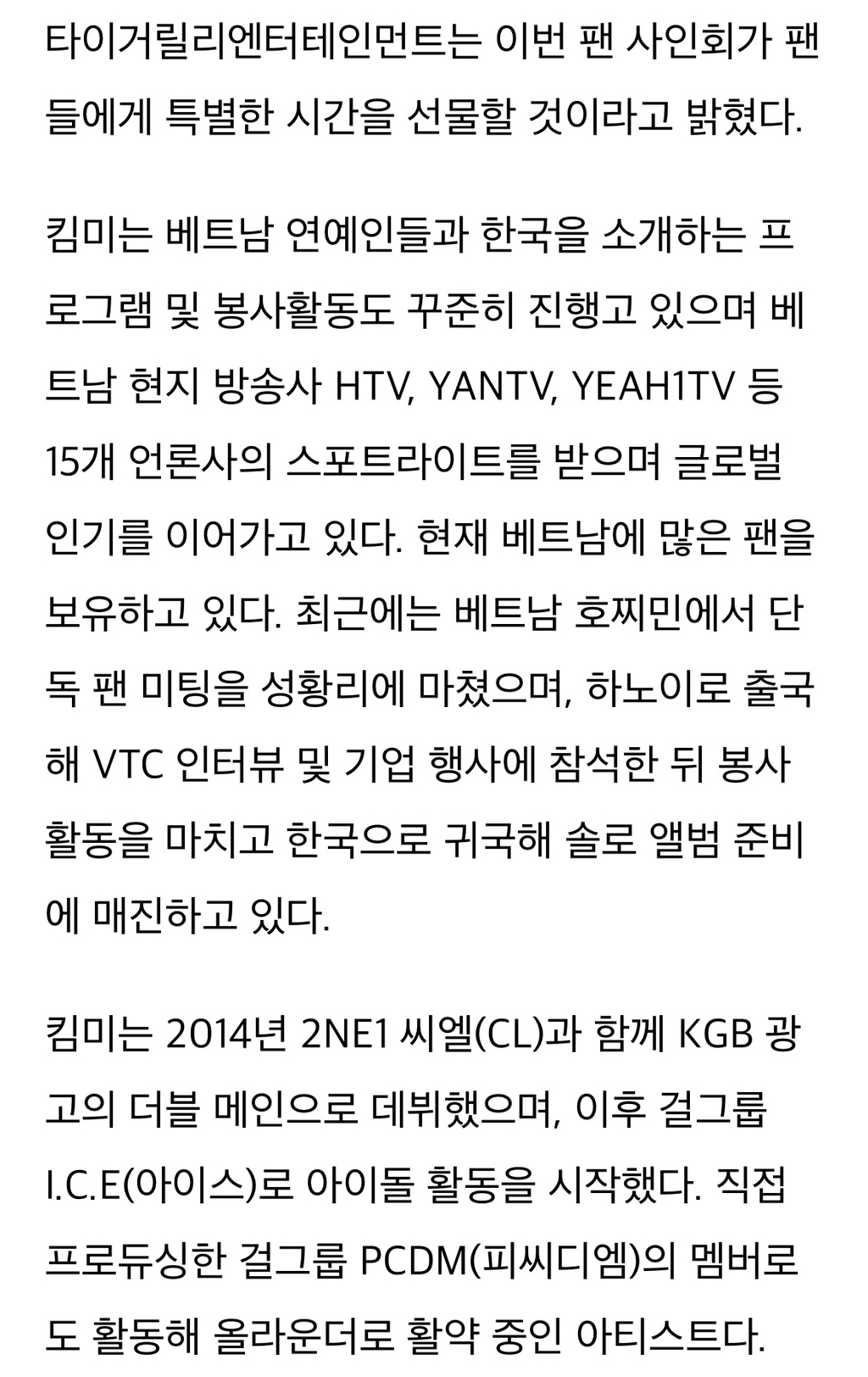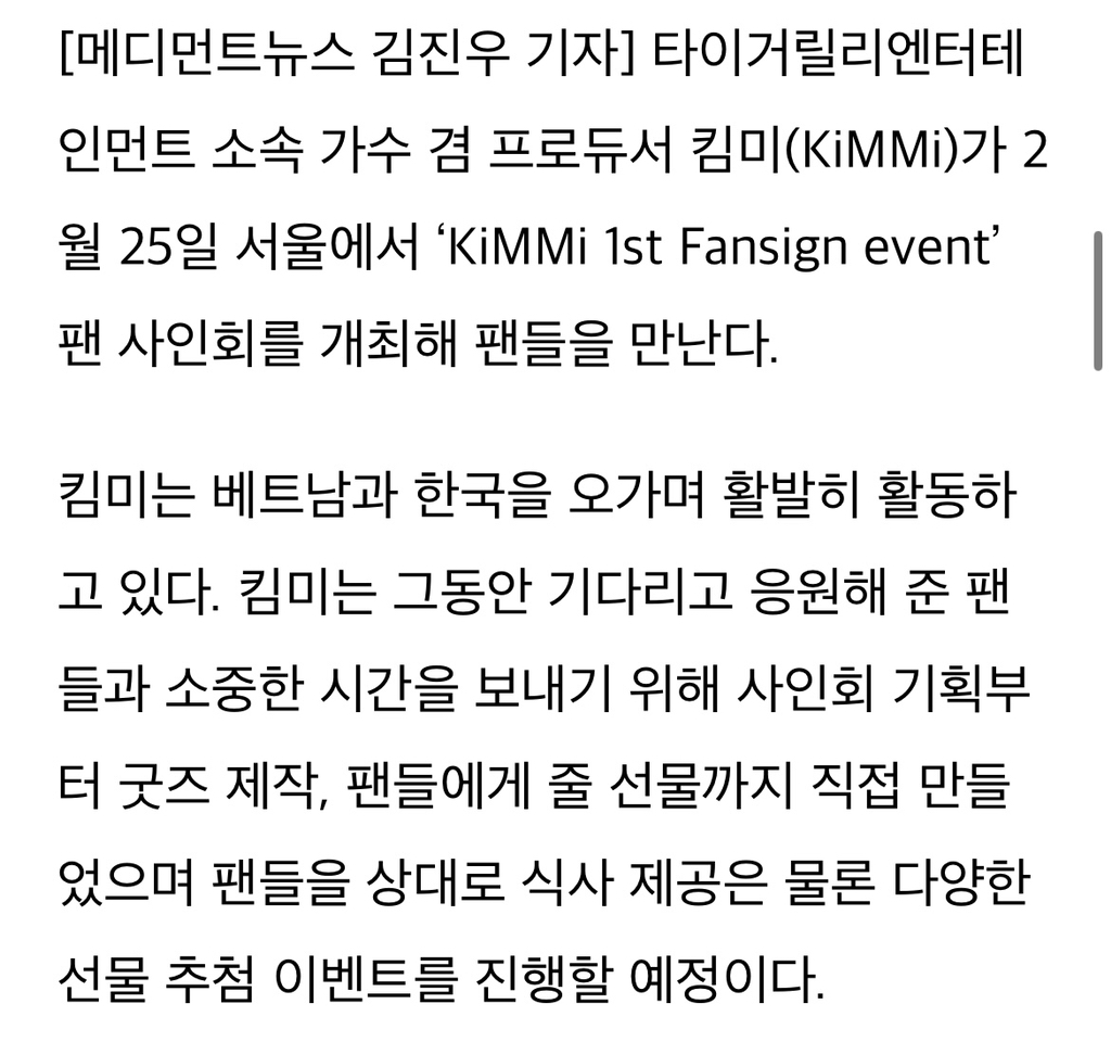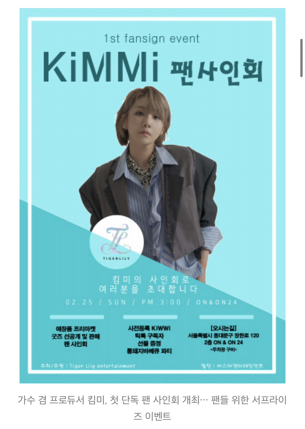 [[기사]](메디먼트N) 가수 겸 프로듀서 킴미, 첫 단독 팬 사인회 개최… 팬들 위한 서프라이즈 이벤트 작성자TigerLily_KiMMi|작성시간24.02.23|조회수23 목록 댓글 0 글자크기 작게가 글자크기 크게가 출처 : http://www.mmnews.co.kr/news/articleView.html?idxno=30629#rs가수 겸 프로듀서 킴미, 첫 단독 팬 사인회 개최… 팬들 위한 서프라이즈 이벤트 - 메디먼트뉴스[메디먼트뉴스 김진우 기자] 타이거릴리엔터테인먼트 소속 가수 겸 프로듀서 킴미(KiMMi)가 2월 25일 서울에서 ‘KiMMi 1st Fansign event’ 팬 사인회를 개최해 팬들을 만난다.킴미는 베트남과 한국을 www.mmnews.co.kr 다음검색 현재 게시글 추가 기능 열기 북마크 공유하기 신고 센터로 신고 댓글 댓글 0 댓글쓰기 답글쓰기 댓글 리스트