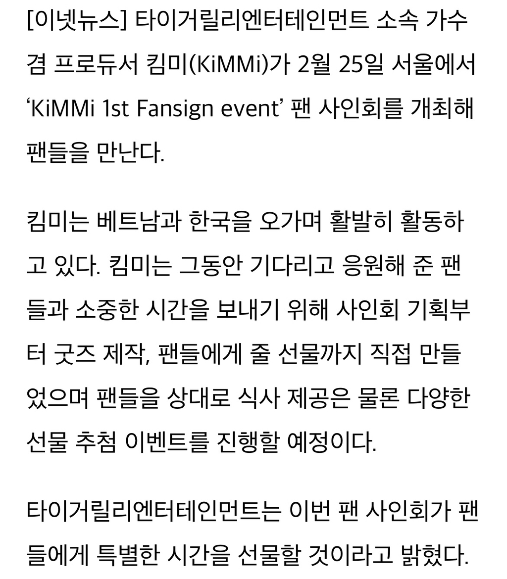 [[기사]](이넷뉴스) 가수 겸 프로듀서 킴미, 첫 단독 팬 사인회 개최… 팬들 위한 서프라이즈 이벤트 작성자TigerLily_KiMMi|작성시간24.02.23|조회수21 목록 댓글 0 글자크기 작게가 글자크기 크게가 출처 : http://www.enetnews.co.kr/news/articleView.html?idxno=20852가수 겸 프로듀서 킴미, 첫 단독 팬 사인회 개최···팬들 위한 서프라이즈 이벤트[이넷뉴스] 타이거릴리엔터테인먼트 소속 가수 겸 프로듀서 킴미(KiMMi)가 2월 25일 서울에서 ‘KiMMi 1st Fansign event’ 팬 사인회를 개최해 팬들을 만난다.킴미는 베트남과 한국을 오가며 활발히 활www.enetnews.co.kr 다음검색 현재 게시글 추가 기능 열기 북마크 공유하기 신고 센터로 신고 댓글 댓글 0 댓글쓰기 답글쓰기 댓글 리스트