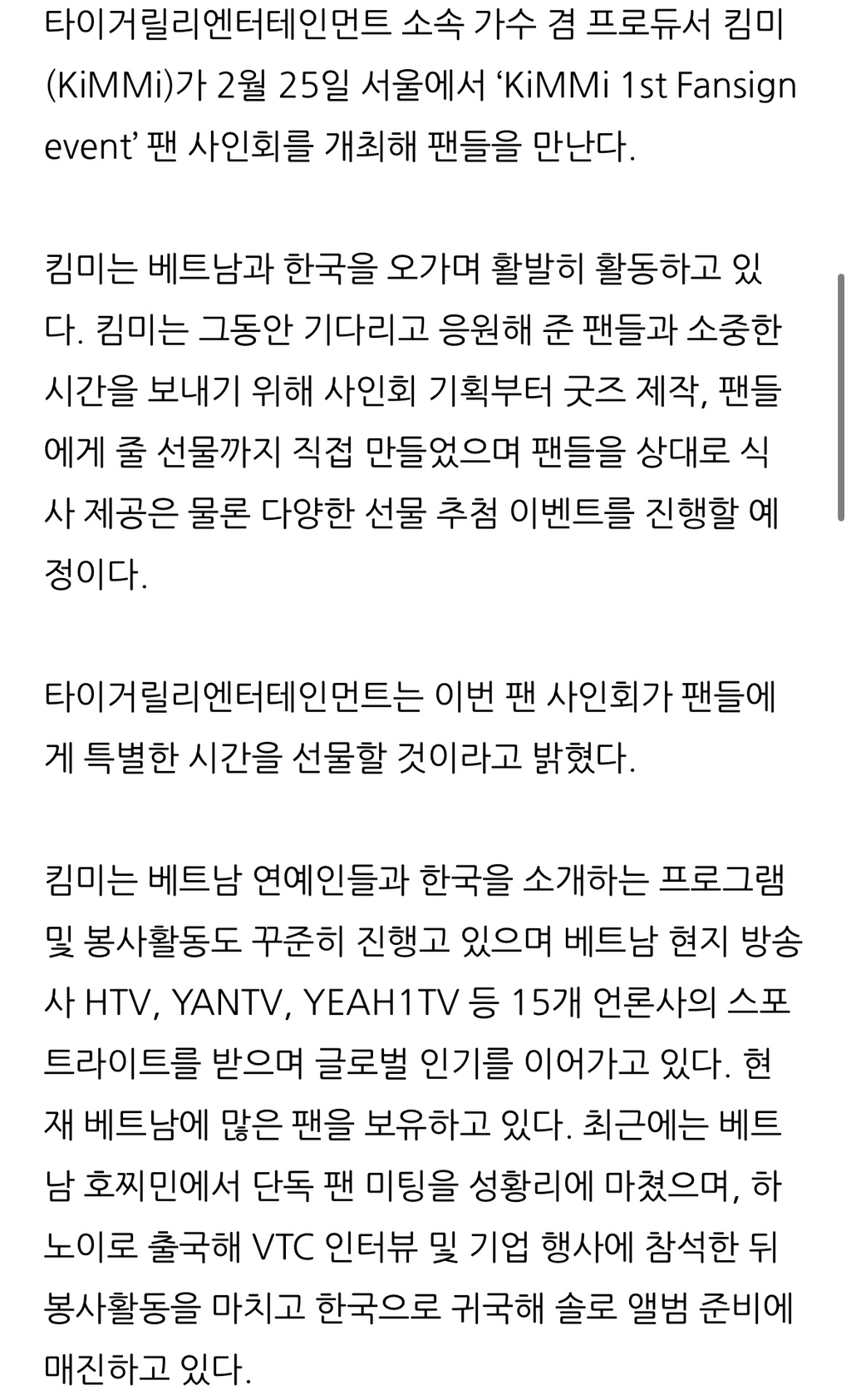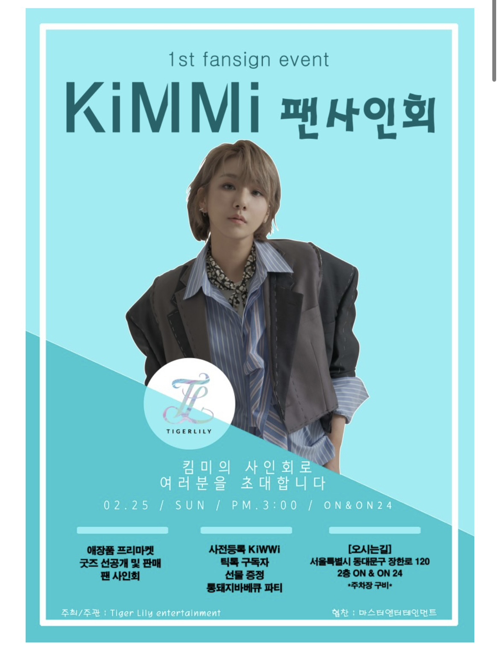 [[기사]](뉴스터치) 가수 겸 프로듀서 킴미, 첫 단독 팬 사인회 개최… 팬들 위한 서프라이즈 이벤트 작성자TigerLily_KiMMi|작성시간24.02.23|조회수53 목록 댓글 0 글자크기 작게가 글자크기 크게가 출처 : https://m.blog.naver.com/PostView.naver?blogId=gozara&logNo=223361444763&proxyReferer=https:%2F%2Fm.search.naver.com%2Fsearch.naver%3Fnso%3D%26page%3D2%26query%3D%25ED%2582%25B4%25EB%25AF%25B8%2B%25ED%258C%25AC%25EC%2582%25AC%25EC%259D%25B8%25ED%259A%258C%26sm%3Dtab_pge%26start%3D1%26where%3Dm_web가수 겸 프로듀서 킴미, 첫 단독 팬 사인회 개최… 팬들 위한 서프라이즈 이벤트타이거릴리엔터테인먼트 소속 가수 겸 프로듀서 킴미(KiMMi)가 2월 25일 서울에서 ‘KiMMi 1st Fans...blog.naver.com 다음검색 현재 게시글 추가 기능 열기 북마크 공유하기 신고 센터로 신고 댓글 댓글 0 댓글쓰기 답글쓰기 댓글 리스트