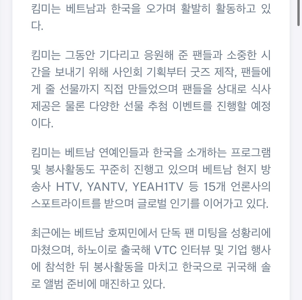 [[기사]](모아픽) 가수 겸 프로듀서 킴미, 첫 단독 팬 사인회 개최… 팬들 위한 서프라이즈 이벤트 작성자TigerLily_KiMMi|작성시간24.02.23|조회수17 목록 댓글 0 글자크기 작게가 글자크기 크게가 출처 : https://moapic.com/view/?idxno=48408가수 겸 프로듀서 킴미, 첫 단독 팬 사인회 개최… 팬들 위한 서프라이즈 이벤트타이거릴리엔터테인먼트 소속 가수 겸 프로듀서 킴미 KiMMi 가 2월 25일 서울에서 KiMMi 1st Fansign event 팬 사인회를 개최해 팬들을 만난다. 킴미는 베트남과 한국을 오가며 활발히 활동하고 있다. 킴moapic.com 다음검색 현재 게시글 추가 기능 열기 북마크 공유하기 신고 센터로 신고 댓글 댓글 0 댓글쓰기 답글쓰기 댓글 리스트