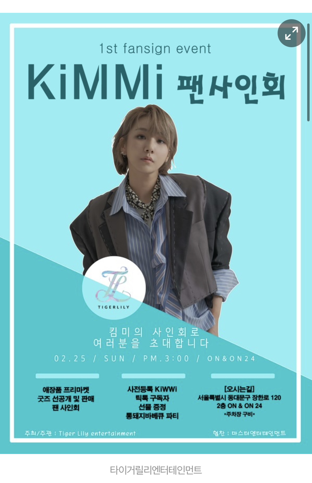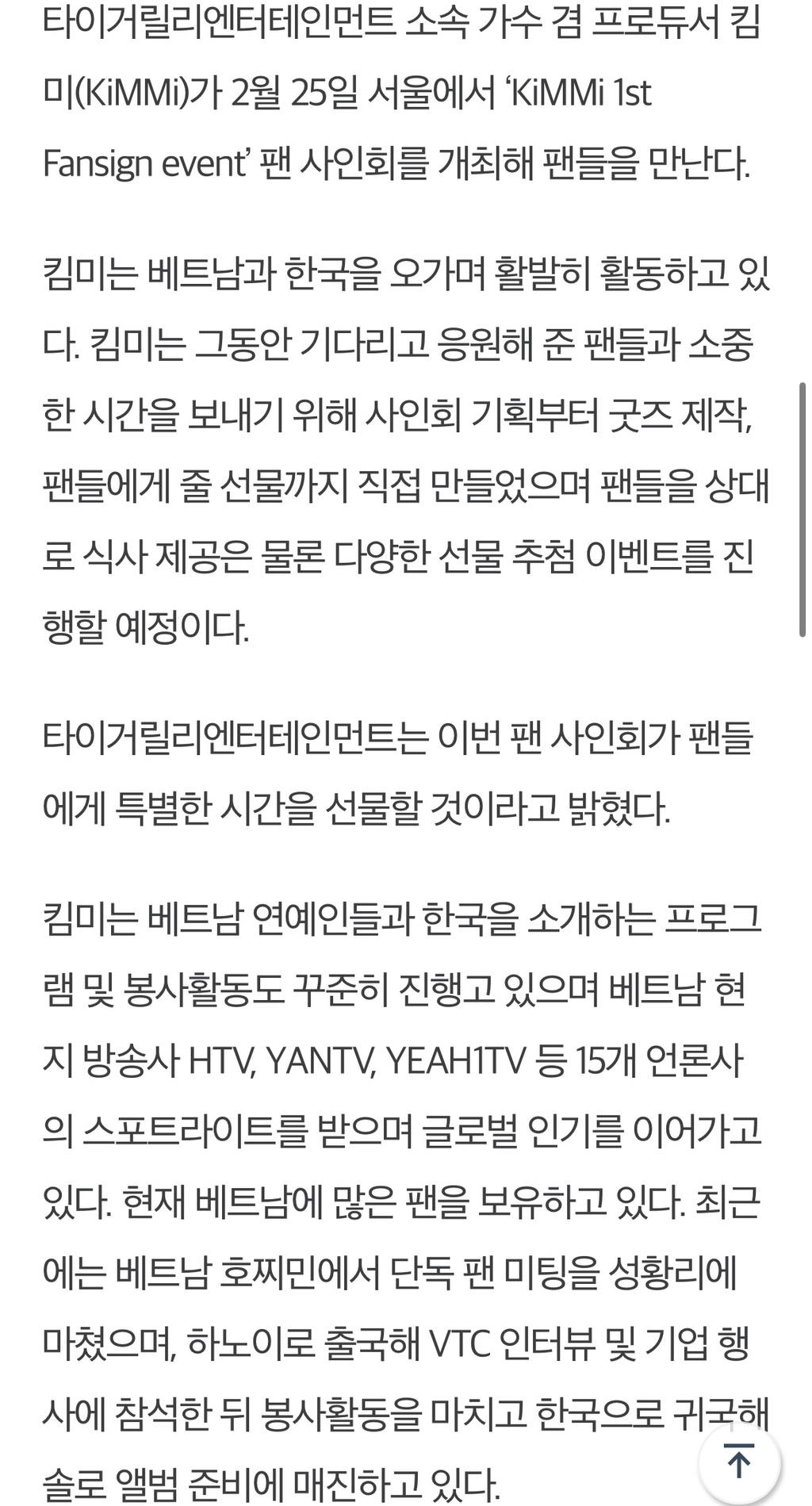 [[기사]](우먼스토리) 가수 겸 프로듀서 킴미, 첫 단독 팬 사인회 개최 작성자TigerLily_KiMMi|작성시간24.02.23|조회수23 목록 댓글 0 글자크기 작게가 글자크기 크게가 출처 : http://www.woman-story.co.kr/news/articleView.html?idxno=6004가수 겸 프로듀서 킴미, 첫 단독 팬 사인회 개최 - 우먼스토리뉴스타이거릴리엔터테인먼트 소속 가수 겸 프로듀서 킴미(KiMMi)가 2월 25일 서울에서 ‘KiMMi 1st Fansign event’ 팬 사인회를 개최해 팬들을 만난다.킴미는 베트남과 한국을 오가며 활발히 활동하고 있다.www.woman-story.co.kr 다음검색 현재 게시글 추가 기능 열기 북마크 공유하기 신고 센터로 신고 댓글 댓글 0 댓글쓰기 답글쓰기 댓글 리스트