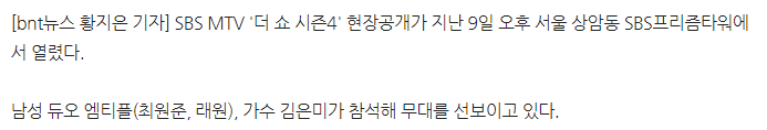[[기사]][bnt포토] 엠티플-김은미 '힐링 보이스~' 작성자TigerLily_OFFICIAL|작성시간23.12.25|조회수16 목록 댓글 0 글자크기 작게가 글자크기 크게가 출처 : https://www.bntnews.co.kr/article/view/bnt201506100190[bnt포토] 엠티플-김은미 '힐링 보이스~'SBS MTV '더 쇼 시즌4' 현장공개가 지난 9일 오후 서울 상암동 SBS프리즘타워에서 열렸다.남성 듀오 엠티플(최원준, 래원), 가수 김은미가 참석해 무대를 선www.bntnews.co.kr 다음검색 현재 게시글 추가 기능 열기 북마크 공유하기 신고 센터로 신고 댓글 댓글 0 댓글쓰기 답글쓰기 댓글 리스트