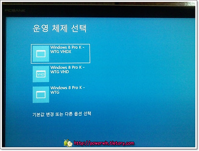 위의 배치 파일로 설치한 WTG 로 부팅한 모습입니다.(남은 윈도우의 설치 과정을 모두 마침) 첫 번째는 USB 드라이브에 바로 설치한 경우이고, 두 번째는 VHD(VHDX) 를 만들어서 설치한 경우입니다.