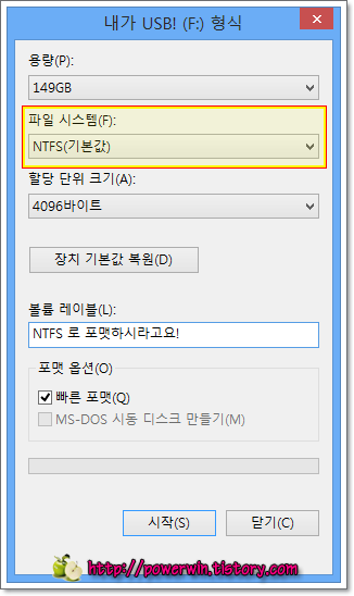 02. 파일 시스템을 NTFS 로 바꿔준 후 포맷하시면 됩니다.