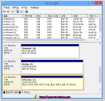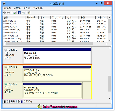 참고로 만약에 USB 외장 하드(플래시 메모리)로 부팅이 되지 않아 나머지 설치 과정을 진행할 수 없다면, 디스크 관리를 통해 WTG 를 설치한 USB 드라이브가 혹시 논리 드라이브는 아닌지 확인해 보세요. 위의 배치 파일은 WTG 를 설치하려는 파티션을 바로 부팅에 사용하도록 만드는 것을 기본으로 한 것이니, WTG 를 설치할 USB 드라이브 파티션의 종류가 주 파티션이어야 합니다. 혹 USB 외장 하드를 파티셔닝하여 사용 중이라면 꼭 확인해 보세요.