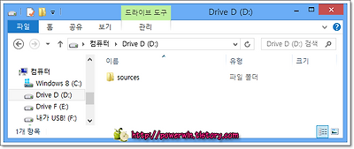 또는 윈도우 8 설치 ISO 파일을 가지고 있는 경우 아래와 같이 install.wim 파일이 포함된 sources 폴더 자체를 특정 드라이브의 루트에 풀어주셔야 합니다. 그 외의 나머지 파일들은 필요 없습니다. 혹 다른 경로에 풀었거나 install.wim 파일만 루트로 풀어 놓은 게 아닌지 확인해 보세요.
