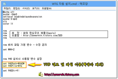 먼저 WTG 자동 설치.cmd 배치 파일을 메모장으로 열어 줍니다. 배치 파일을 확인해보면 시작 부분에 VHD 기본 설정이 위치해 있습니다. 해당 설정을 원하는 경로와 파일 이름(확장자 제외)으로 변경하시고 저장하신 후 다시 실행하여 작업을 시작하시면 됩니다.