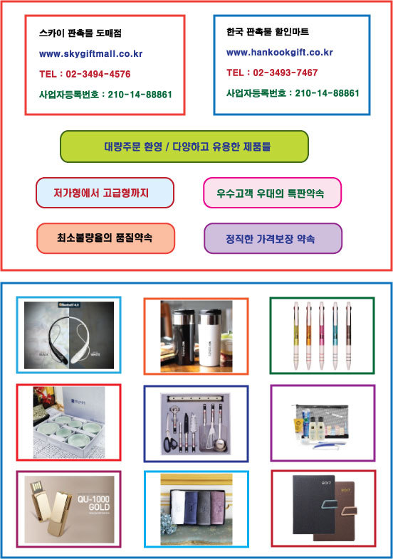 판촉물, 기념품 전문 [스카이 판촉물 도매점][한국 판촉물 할인마트]입니다. 저희는