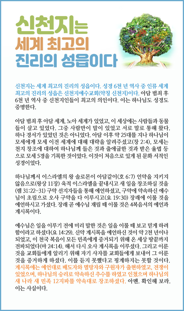 많은 사람들이 신천지로 몰려든 이유는 세계 최고의 진리가 있기 때문입니다.