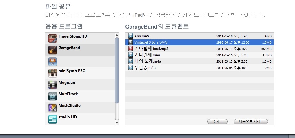가져오기를 선택하면 아래와 같은 창이 뜨면서 좀 전에 아이튠즈에서 보낸 오디오 파일이 뜹니다.