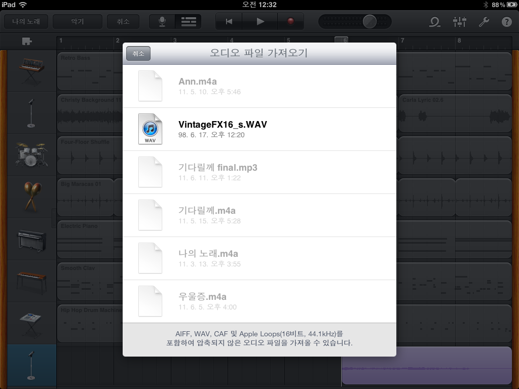 AIFF, WAV, CAF, Apple Loops 등 압축되지 않은 오디오 파일을 컴퓨터에서 가져와서 작업에 활용할수 있게되었습니다. 즉, mp3나 ogg같은 압축파일은 지원하지 않습니다. 가지고 계신 wav형태의 오디오 샘플이나 맥용 개러지밴드에서 쓰던 Apple Loops를 아이패드로 가져와서 쓸수 있습니다.