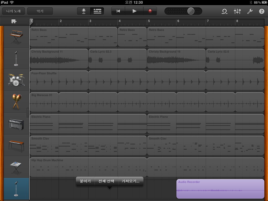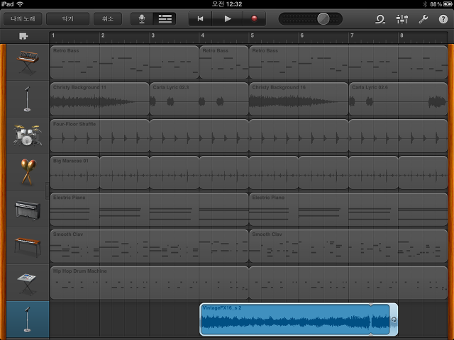 가져온 오디오 파일이 개러지밴드의 트랙에 위와같이 추가됩니다.