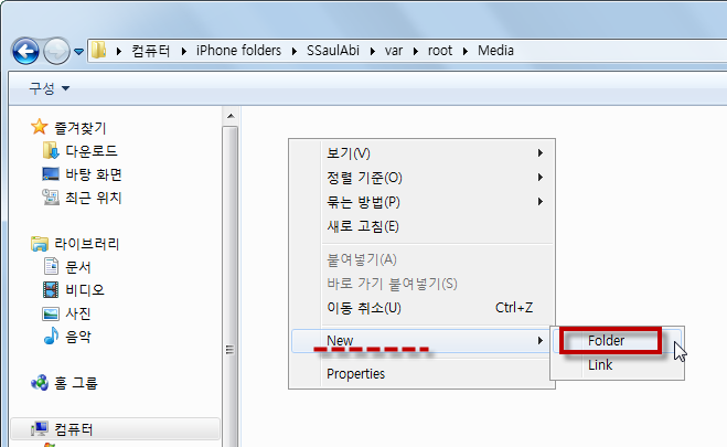 2) 여기서 오른쪽 클릭해서 새 폴더를 만들어줍니다. 폴더 이름은 Cydia 입니다. 대소문자 구분하니까 정확하게 입력하셔야 합니다. 그리고 Cydia 폴더를 더블클릭해서 들어간 후 거기서 또 폴더를 하나 더 만들어줍니다. 이름은 Autoinstall 입니다.