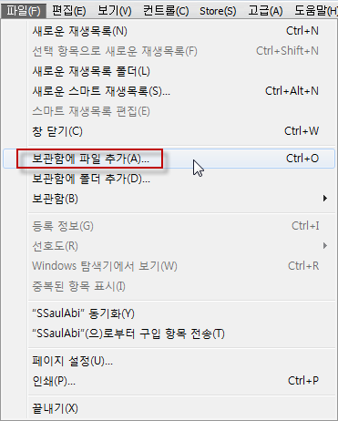 2. 아이튠즈 메뉴의 파일에서 "보관함에 파일 추가"를 선택합니다.