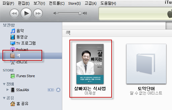 1. 아이튠즈를 실행하고 보관함의 책을 선택합니다.(안보이면 메뉴의 [편집]-[기본설정]에 들어가서 일반탭에서 책 선택해주면 나옵니다.)