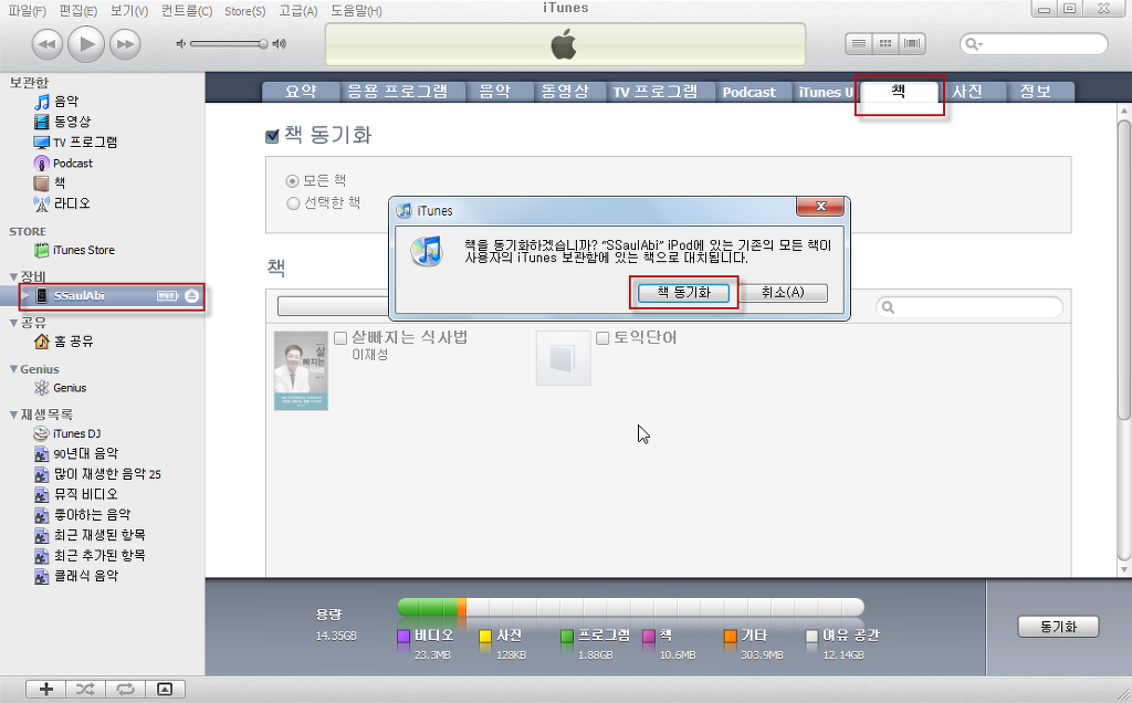 5. 이제 장비의 자신의 아이폰 선택하고, "책"탭을 선택합니다. 그리고 "책 동기화"에 체크를 하면 동기화를 할거냐고 물어봅니다. "책 동기화" 선택합니다.