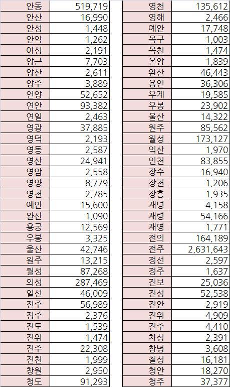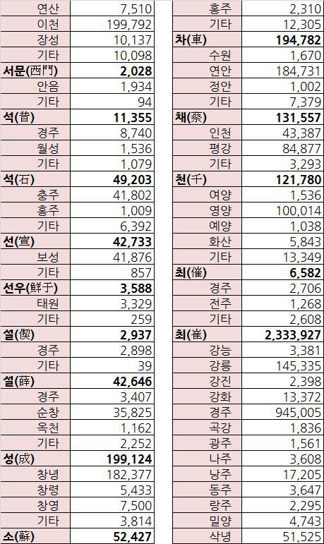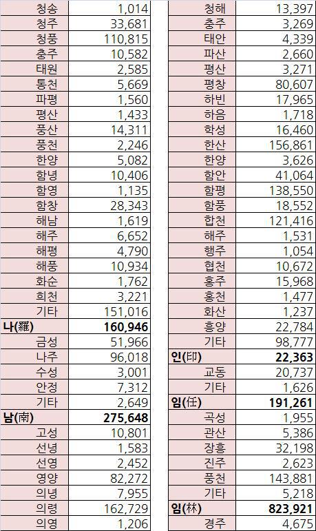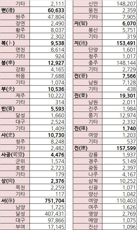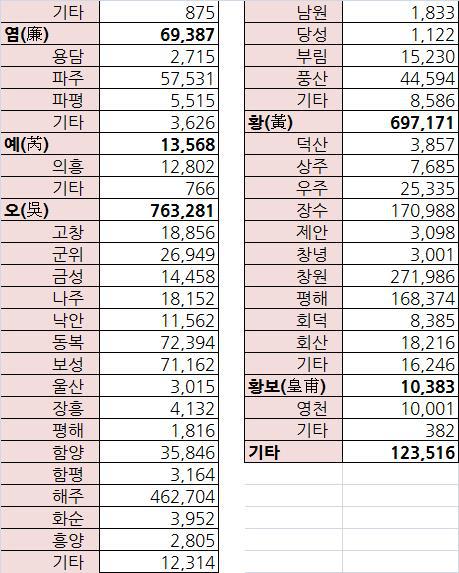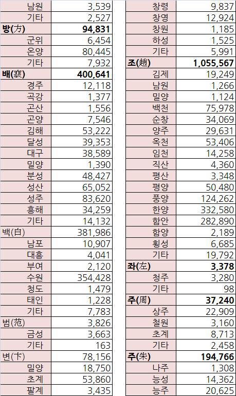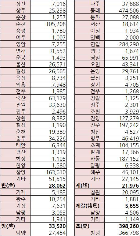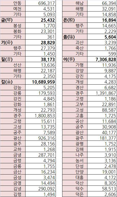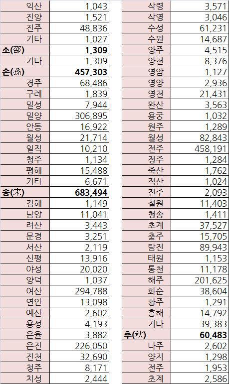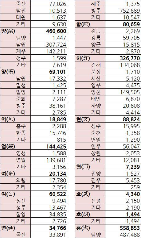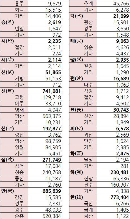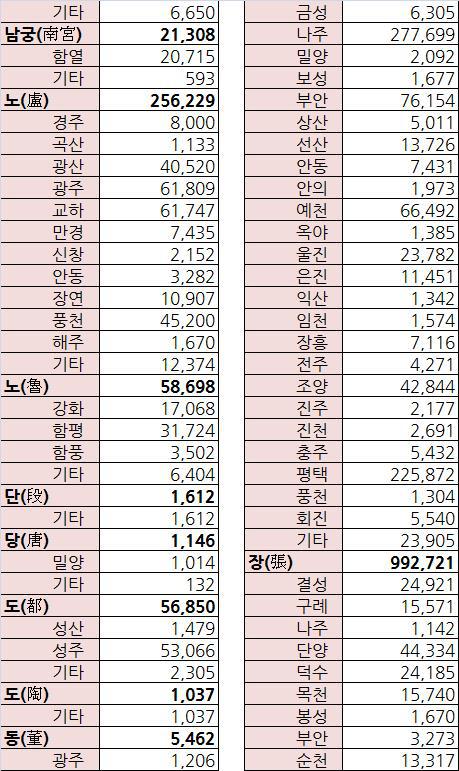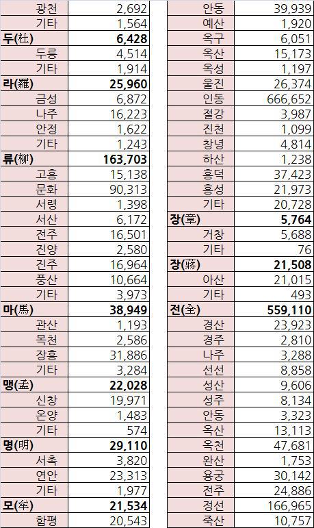 안동권(權)씨(70만명), 안동張씨(67만명), 평산신(申)씨(56만명), 순흥안(安)씨(52만명), 안동金씨(52만명) 등도 50만명이 넘는 성씨본관이었다.