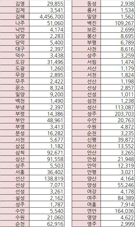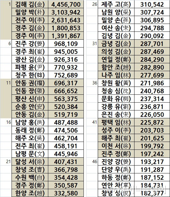 상위 20대 성씨본관을 보면 김해金씨가 446만명으로 가장 많았다. 전체 인구의 9.0%에 해당하는 수치다. 이어 밀양朴씨와 전주李씨가 각각 6.2%(310만명)와 5.3%(263만명)로 많았다.