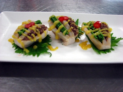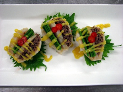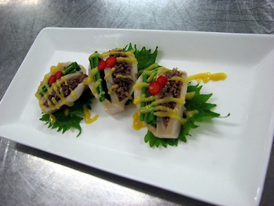 재료 : 관자살 3EA, 소고기민찌 0.05kg, 부추 0.02kg, 겨자소스, 소금, 후추
