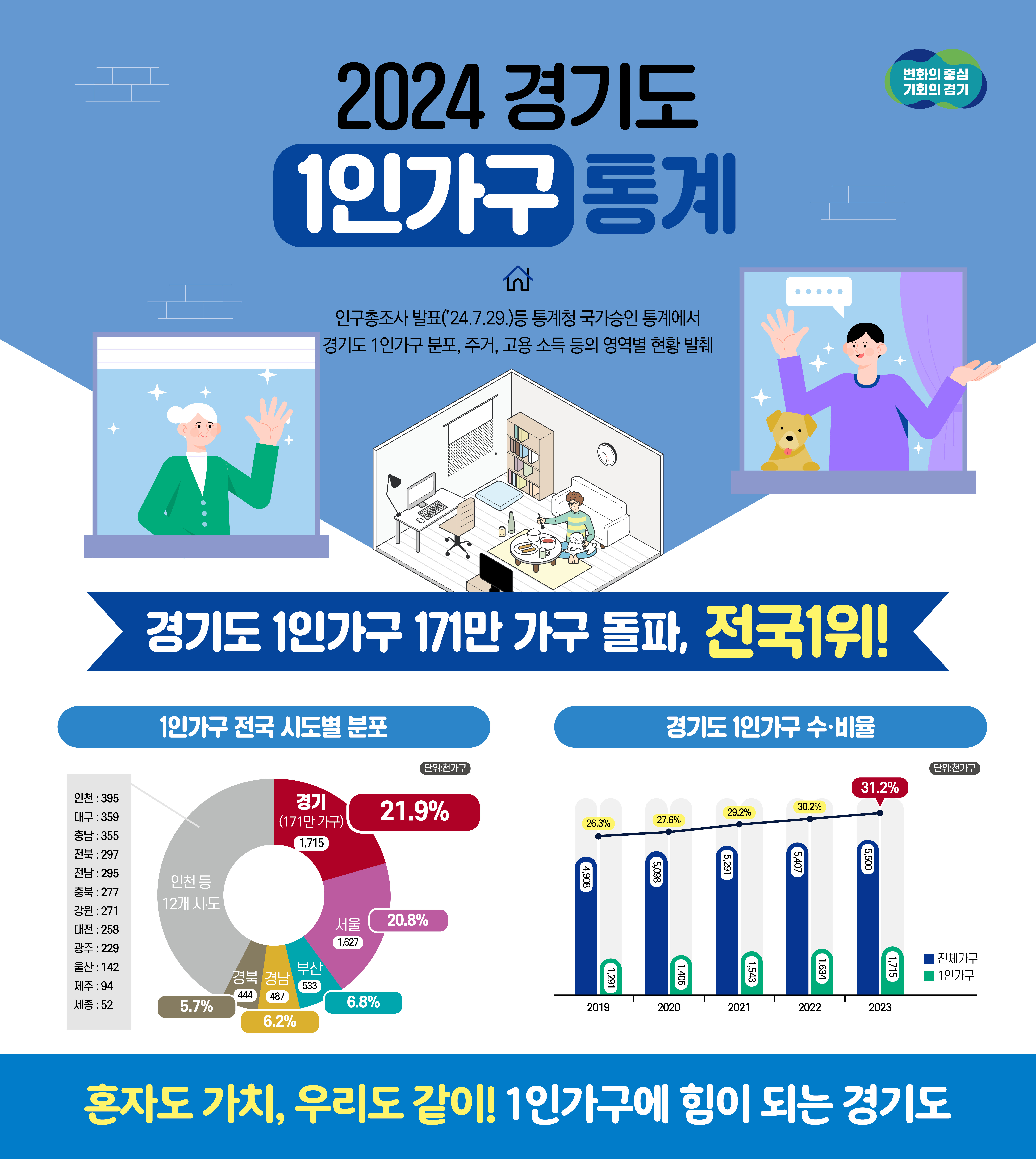 경기도의 1인가구 수는 전년(163만) 대비 약 8만 가구가 증가한 171만5천 가구로 집계됐으며, 이는 도 전체 가구(550만) 중 31.2%를 차지한다. 경기도의 1인가구 수와 비중은 매년 증가세를 보이고 있으며 전국 1인가구의 21.9%가 경기도에 거주하는 것으로 조사됐다. 1인가구 수는 2020년부터 서울시를 넘어서 매년 전국 1위를 기록하고 있다.