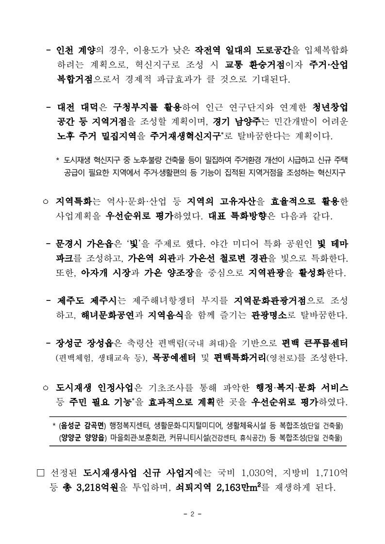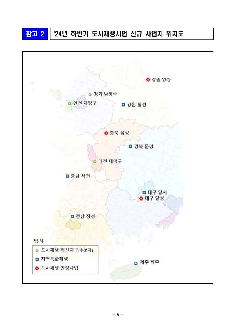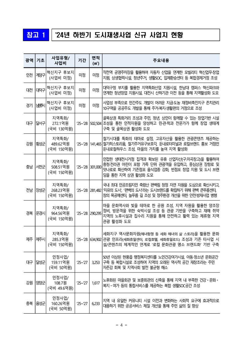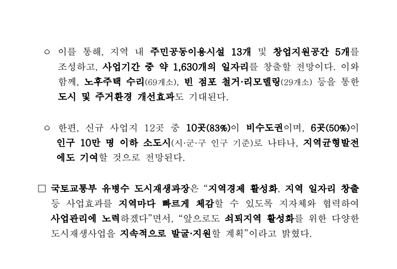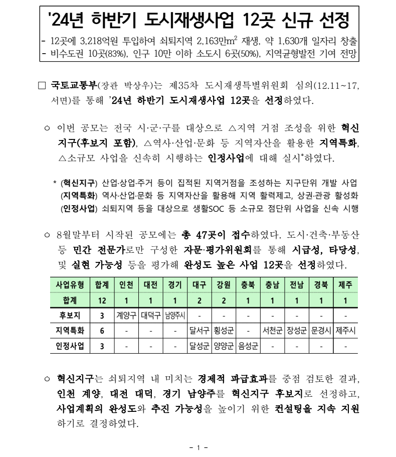 '24년 하반기 도시재생사업 12곳 신규 선정 작성자청솔|작성시간24.12.23|조회수8 목록 댓글 0 글자크기 작게가 글자크기 크게가 '24년 하반기 도시재생사업 12곳 신규 선정 12곳에 3,218억원 투입하여 쇠퇴지역 2,163만m2 재생, 약 1,630개 일자리 창출비수도권 10곳(83%), 인구 10만 이하 소도시 6곳(50%), 지역균형발전 기여 전망 출처 : 국토교통부 다음검색 현재 게시글 추가 기능 열기 북마크 공유하기 신고 센터로 신고 댓글 댓글 0 댓글쓰기 답글쓰기 댓글 리스트