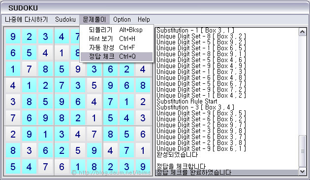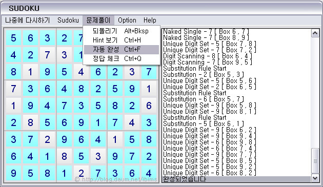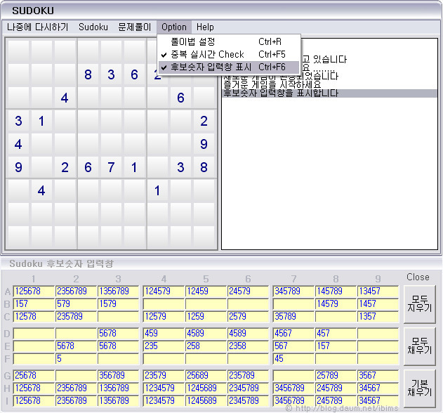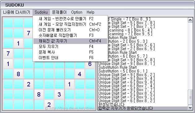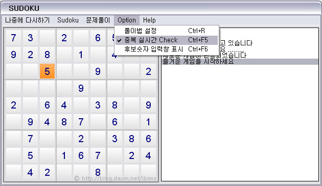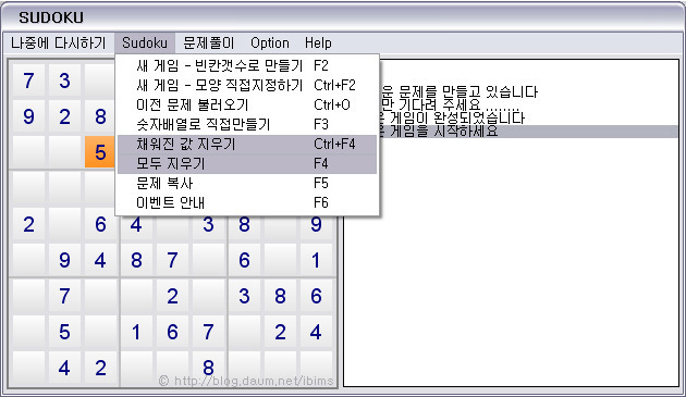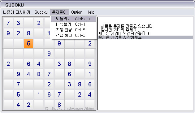 우선은 새게임 혹은 직접 만들기 메뉴를 이용하여 문제가 입력되어 있어야 합니다.