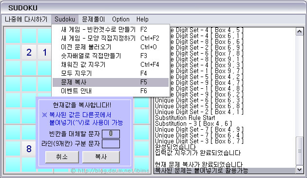 Sudoku 메뉴의 문제 복사를 선택하신 후 표시된 창에서 빈칸을 대체할 문자와 라인 구분 문자를 지정하고 복사를 누르시면 됩니다.