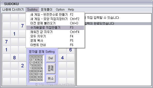 Sudoku 메뉴의 직접 만들기를 선택하신 다음 문자열 문제를 입력 혹은 붙여넣기 하신 후 문제입력 버튼을 누르시면 됩니다.