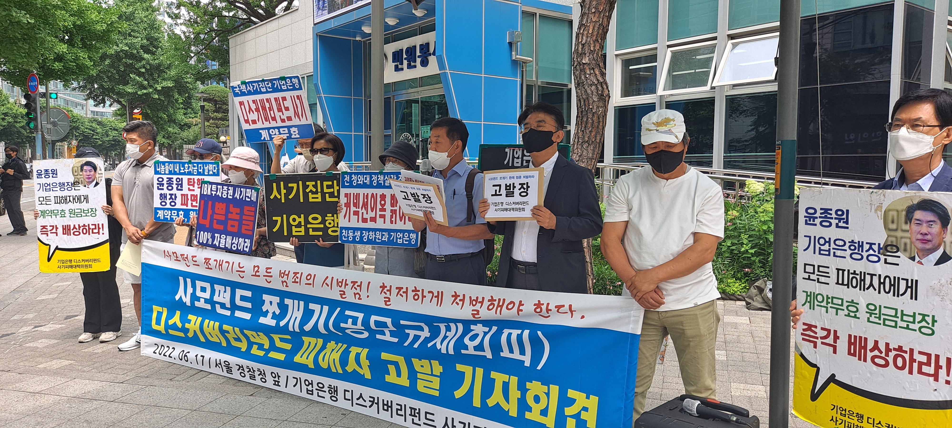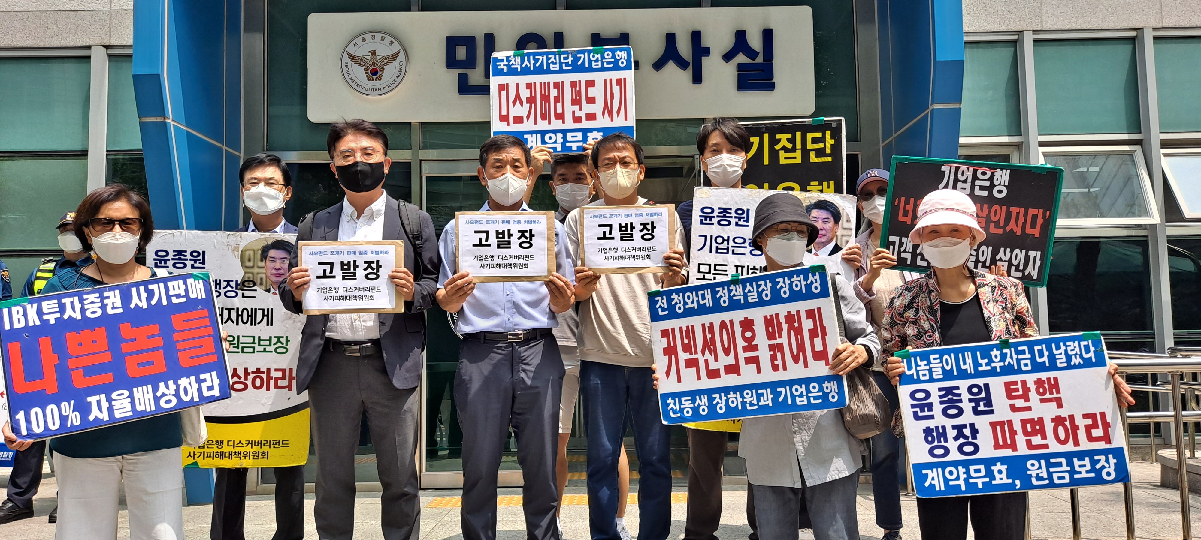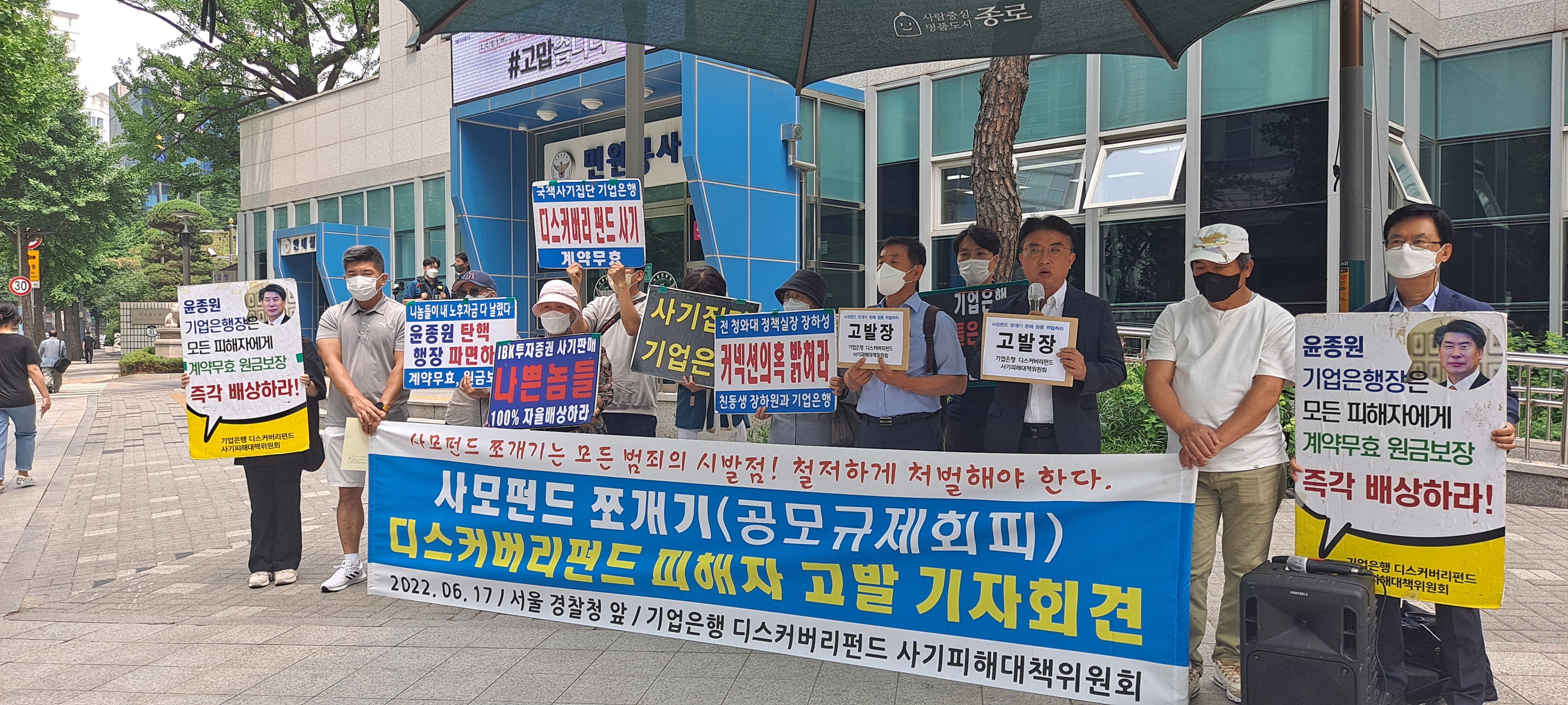 1) 기업은행 디스커버리펀드 사기피해 대책위원회(위원장 최창석, 이하 “대책위”)는 6. 17 금요일 오전 11시 내자동 서울경찰청 앞에서 「사모펀드쪼개기(공모규제회피) 디스커버리펀드 피해자 고발 기자회견」을 개최한 후 고발장을 서울 경찰청에 접수하였다.