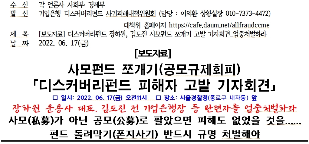 1) 제목 : 「사모펀드쪼개기(공모규제회피) 디스커버리펀드 피해자 고발 기자회견」