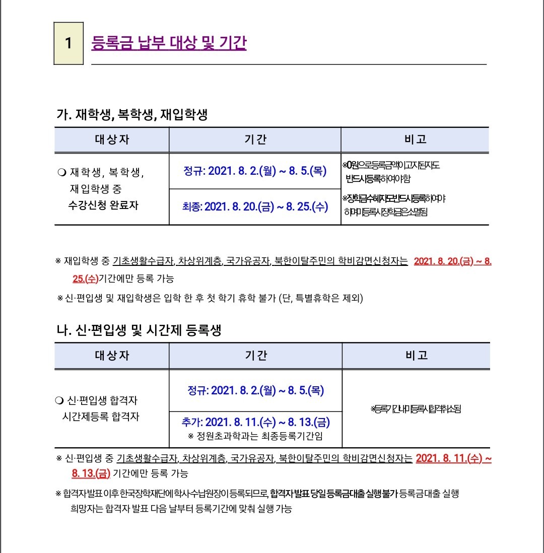2021학년도 2학기 학부생 및 신.편입생,시간제등록생 등록금 납부 공고