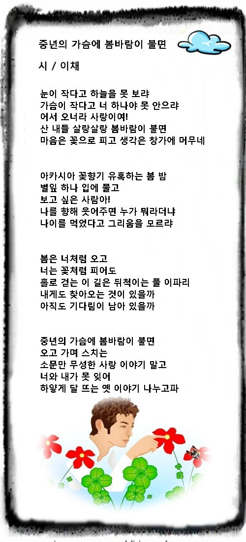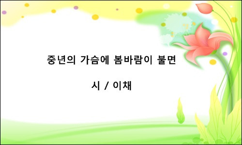 4월 9일--중년의 가슴에 봄바람이 불면 작성자이채|작성시간25.03.31|조회수35 목록 댓글 0 글자크기 작게가 글자크기 크게가 4월 9일--중년의 가슴에 봄바람이 불면 > 아침시 | 이채의 뜨락.. 다음검색 현재 게시글 추가 기능 열기 북마크 공유하기 신고 센터로 신고 댓글 댓글 0 댓글쓰기 답글쓰기 댓글 리스트