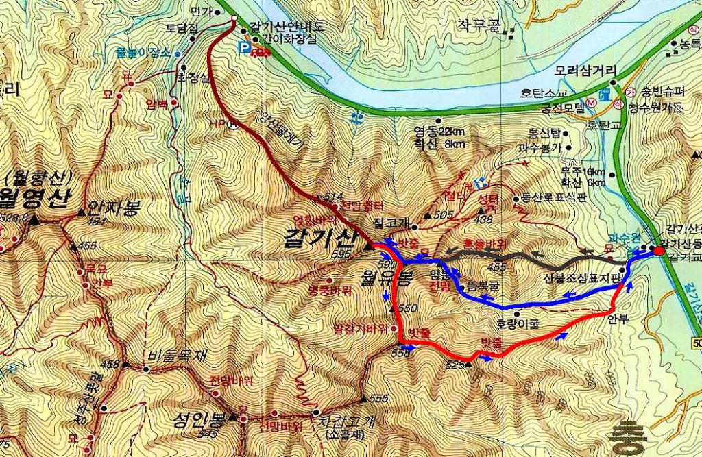 갈기산 관광농원~ 455m봉 동릉~ 흔들바위~590m(월유봉)~정상 / 약 1.8 km·2시간 소요.