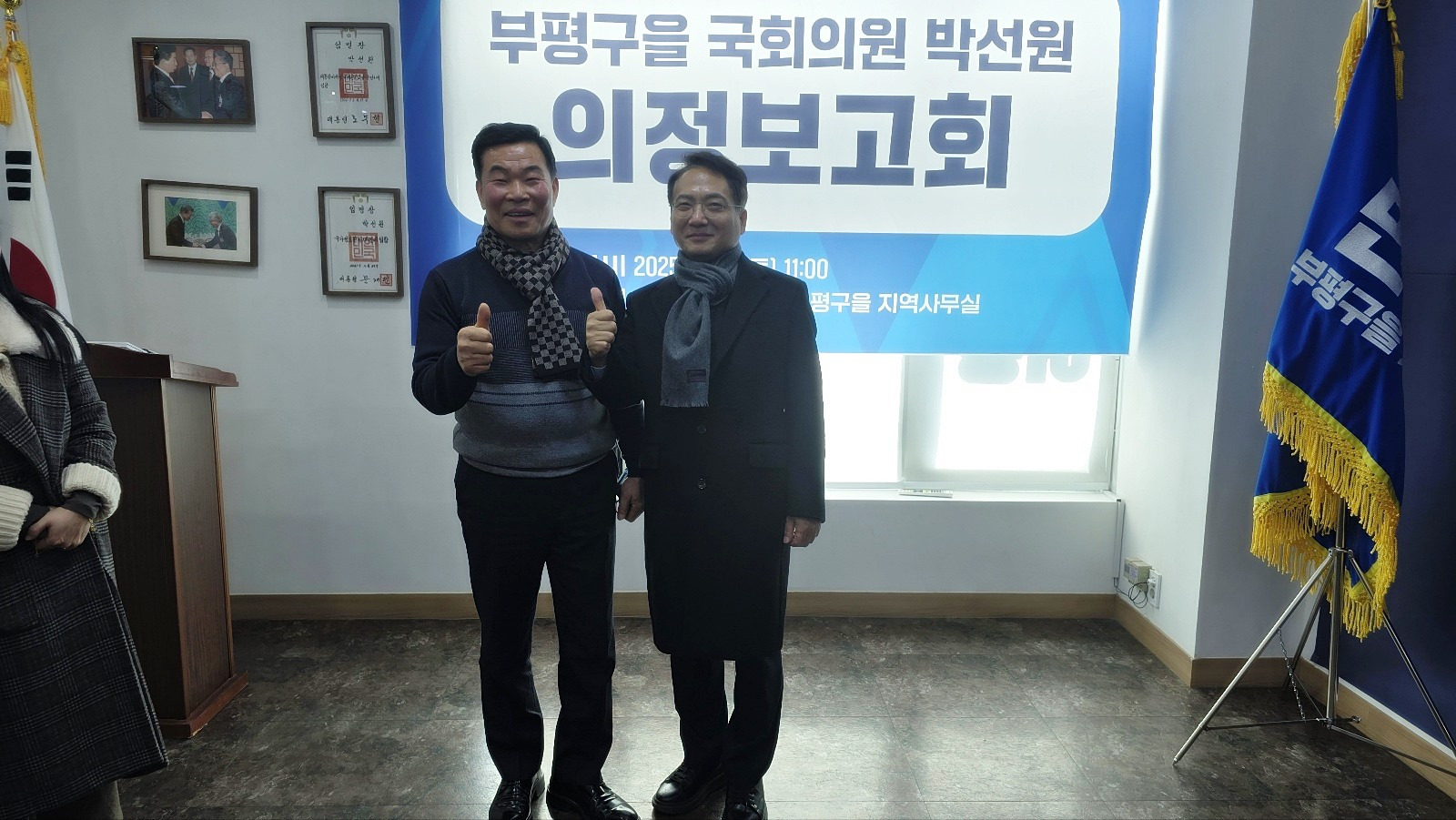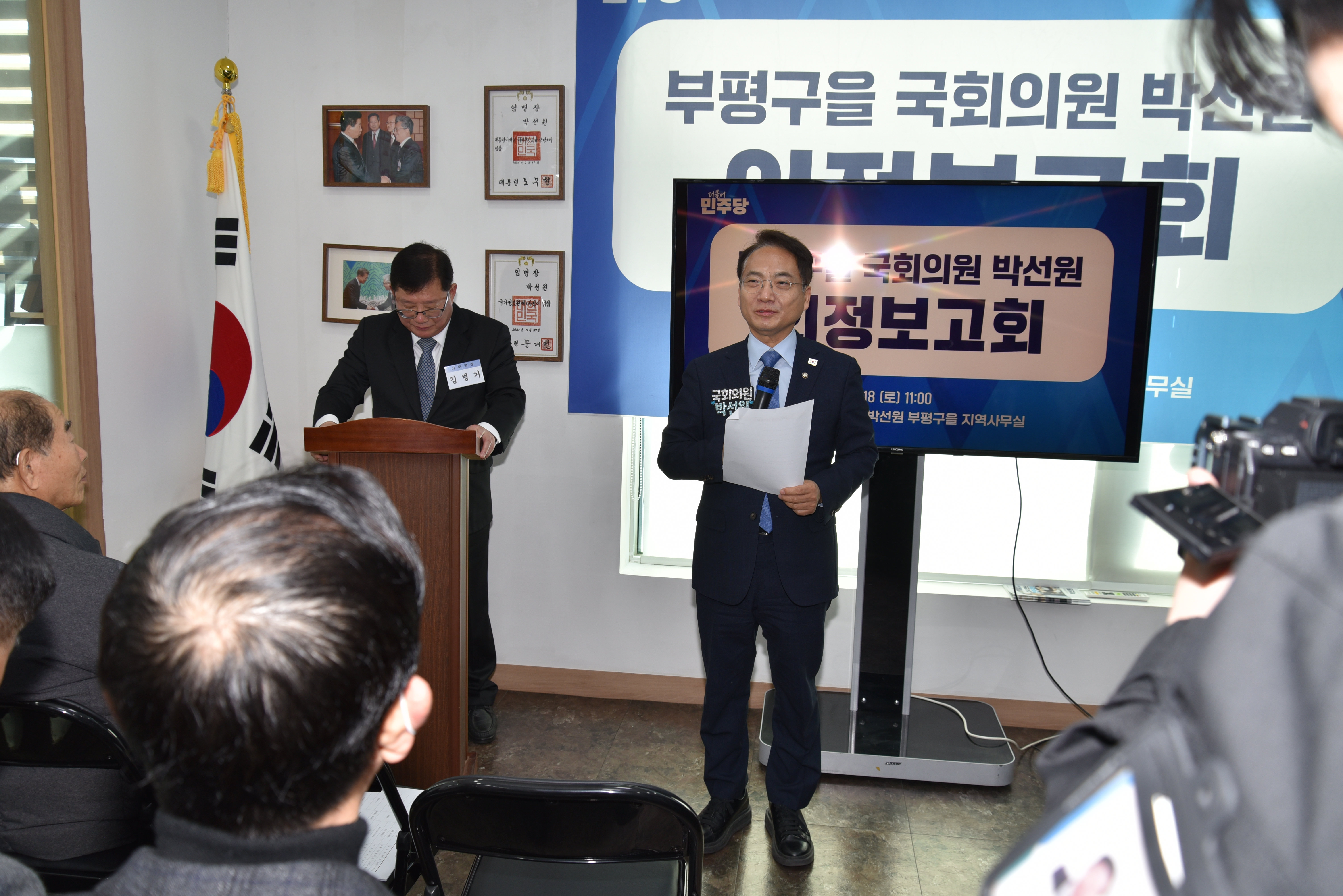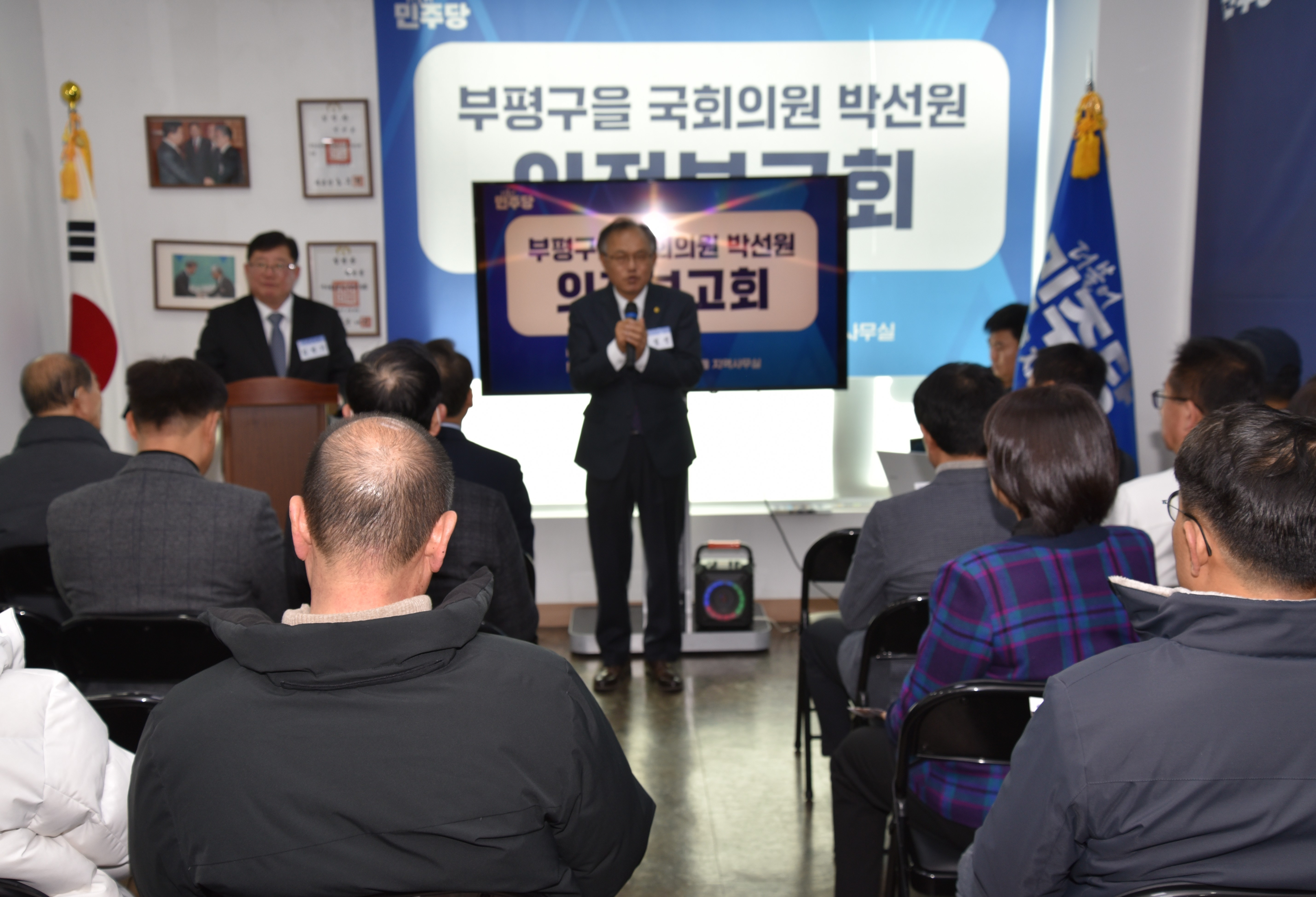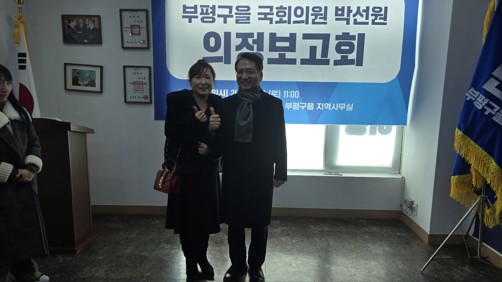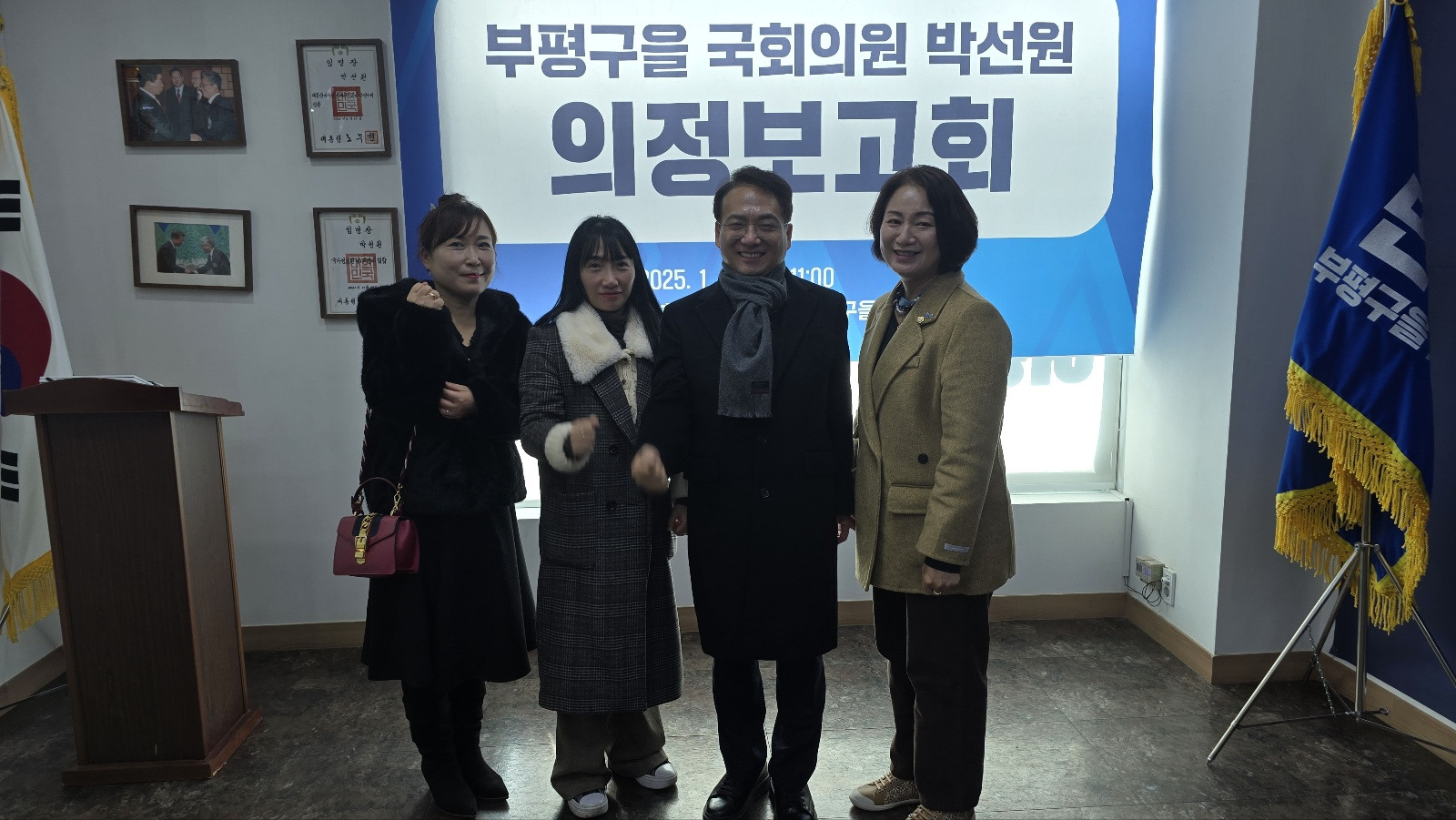 이날 박선원 의원은 2025년 1월 11일(수) 오전 11시 인천광역시 부평구 길주로 659 미라쥬타워 307호 지역사무소에서 김병기 사무국장 진행으로 부평구민에게 2024년 의정활동 성과를 직접 보고 하였다.