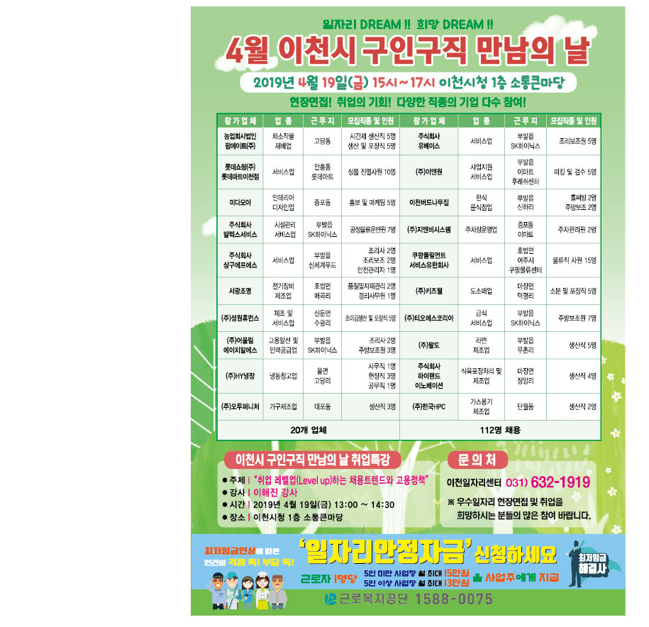 이천시 4월 구인구직 만남의 날 행사 안내 작성자가을동화|작성시간19.04.03|조회수145 목록 댓글 0 글자크기 작게가 글자크기 크게가 다음검색 현재 게시글 추가 기능 열기 북마크 공유하기 신고 센터로 신고 댓글 댓글 0 댓글쓰기 답글쓰기 댓글 리스트