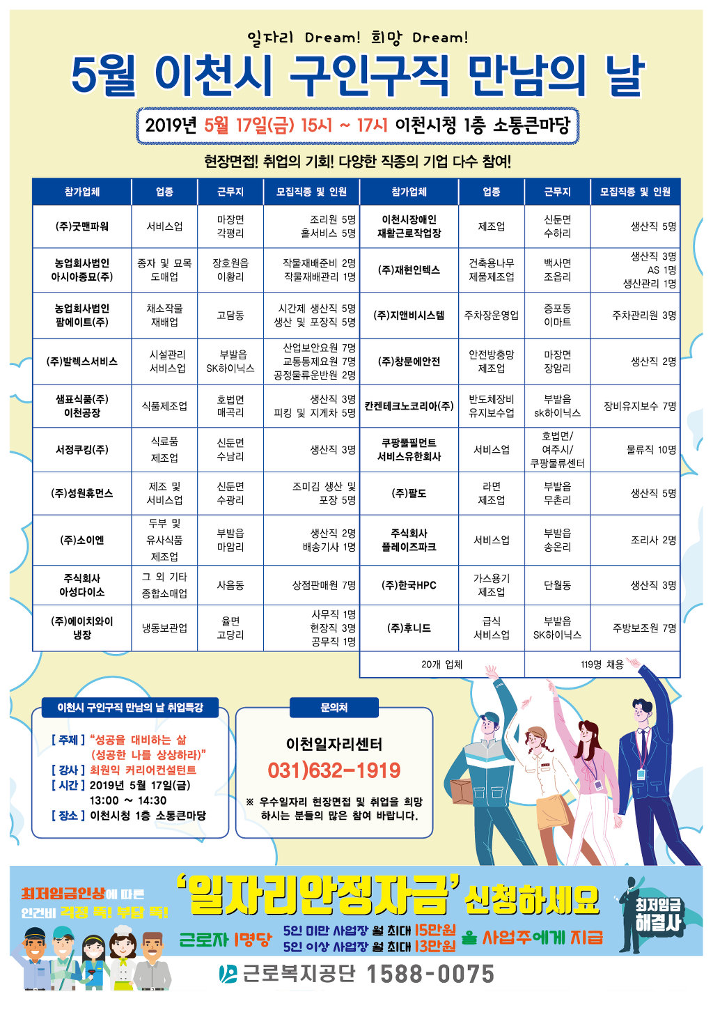 5월 이천시 구인구직 만남의 날 행사 안내 작성자이천일자리센터박미소|작성시간19.05.07|조회수81 목록 댓글 1 글자크기 작게가 글자크기 크게가 다음검색 현재 게시글 추가 기능 열기 북마크 공유하기 신고 센터로 신고 댓글 댓글 1 댓글쓰기 답글쓰기 댓글 리스트 작성자현아포레버 | 작성시간 19.05.21 유용한 정보가 많이 있는거 같아요 댓글 전체보기
