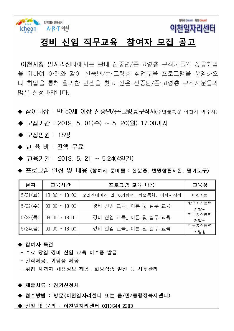 이천일자리센터 경비신임직무교육 참여자 모집 작성자가을동화|작성시간19.05.09|조회수81 목록 댓글 0 글자크기 작게가 글자크기 크게가 2019경비신임 직무교육 참가신청서.hwp 첨부파일첨부된 파일이 2개 있습니다. jpg 파일 경비신임직무교육 모집공고001.jpg 다운로드 hwp 파일 2019경비신임 직무교육 참가신청서.hwp 다운로드 다음검색 현재 게시글 추가 기능 열기 북마크 공유하기 신고 센터로 신고 댓글 댓글 0 댓글쓰기 답글쓰기 댓글 리스트