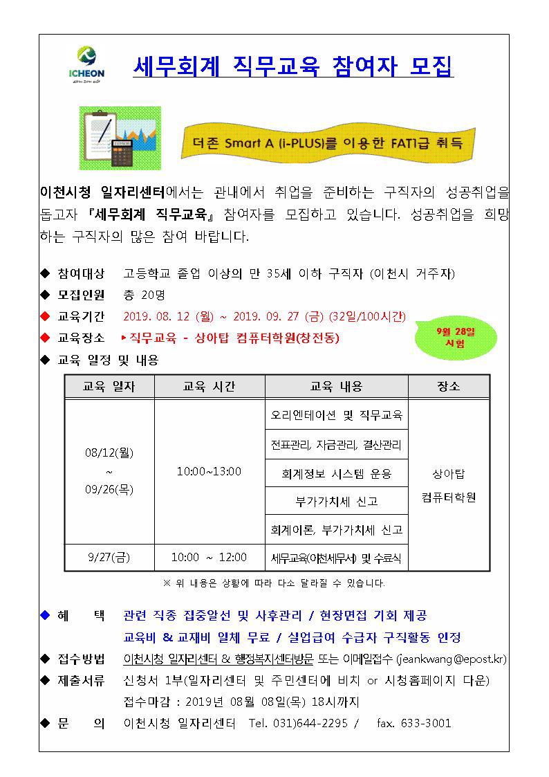 2019년 세무회계 직무교육 참여자 모집 작성자어울려요|작성시간19.07.16|조회수92 목록 댓글 0 글자크기 작게가 글자크기 크게가 2019 세무회계 직무교육 참가 신청서.hwp 첨부파일첨부된 파일이 2개 있습니다. jpg 파일 2019년 세무회계 직무교육 참가자 모집공고001.jpg 다운로드 hwp 파일 2019 세무회계 직무교육 참가 신청서.hwp 다운로드 다음검색 현재 게시글 추가 기능 열기 북마크 공유하기 신고 센터로 신고 댓글 댓글 0 댓글쓰기 답글쓰기 댓글 리스트