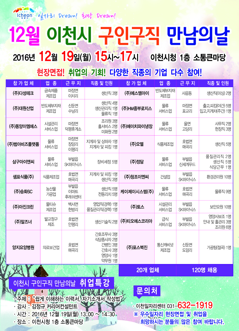 2016년 12월 19일 (월) 구인구직 만남의 날 작성자이천시청 일자리센터|작성시간16.12.02|조회수163 목록 댓글 0 글자크기 작게가 글자크기 크게가 다음검색 현재 게시글 추가 기능 열기 북마크 공유하기 신고 센터로 신고 댓글 댓글 0 댓글쓰기 답글쓰기 댓글 리스트