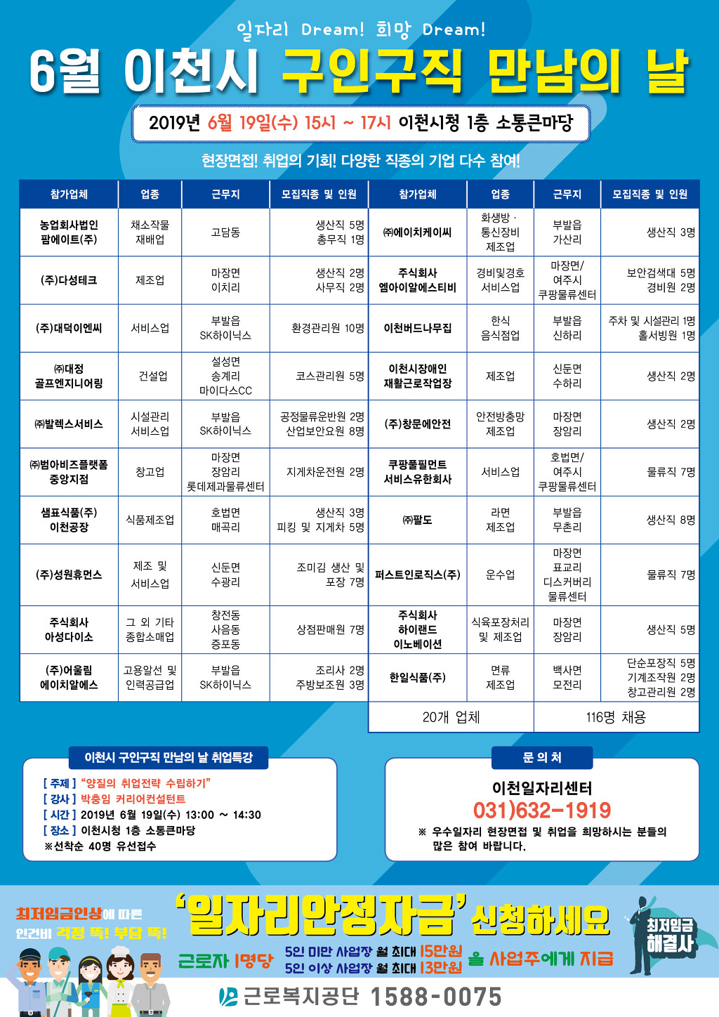 6월 구인구직 만남의날 행사 안내 작성자어울려요|작성시간19.06.07|조회수83 목록 댓글 0 글자크기 작게가 글자크기 크게가 다음검색 현재 게시글 추가 기능 열기 북마크 공유하기 신고 센터로 신고 댓글 댓글 0 댓글쓰기 답글쓰기 댓글 리스트