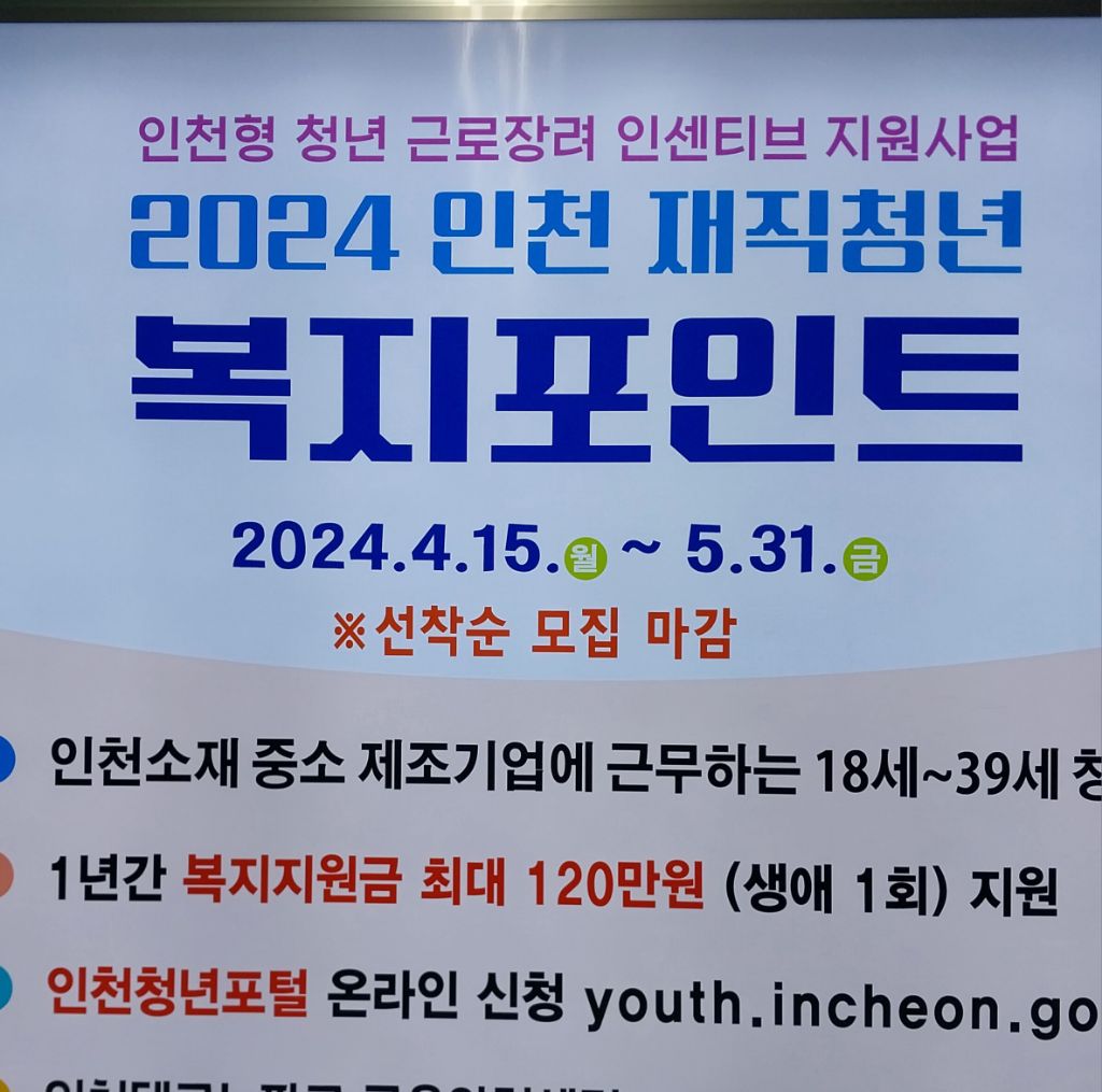1년간 복지원금 최대 120만원 을 받을 수 있는 인천 재직청년 복지 포인트 2024 년