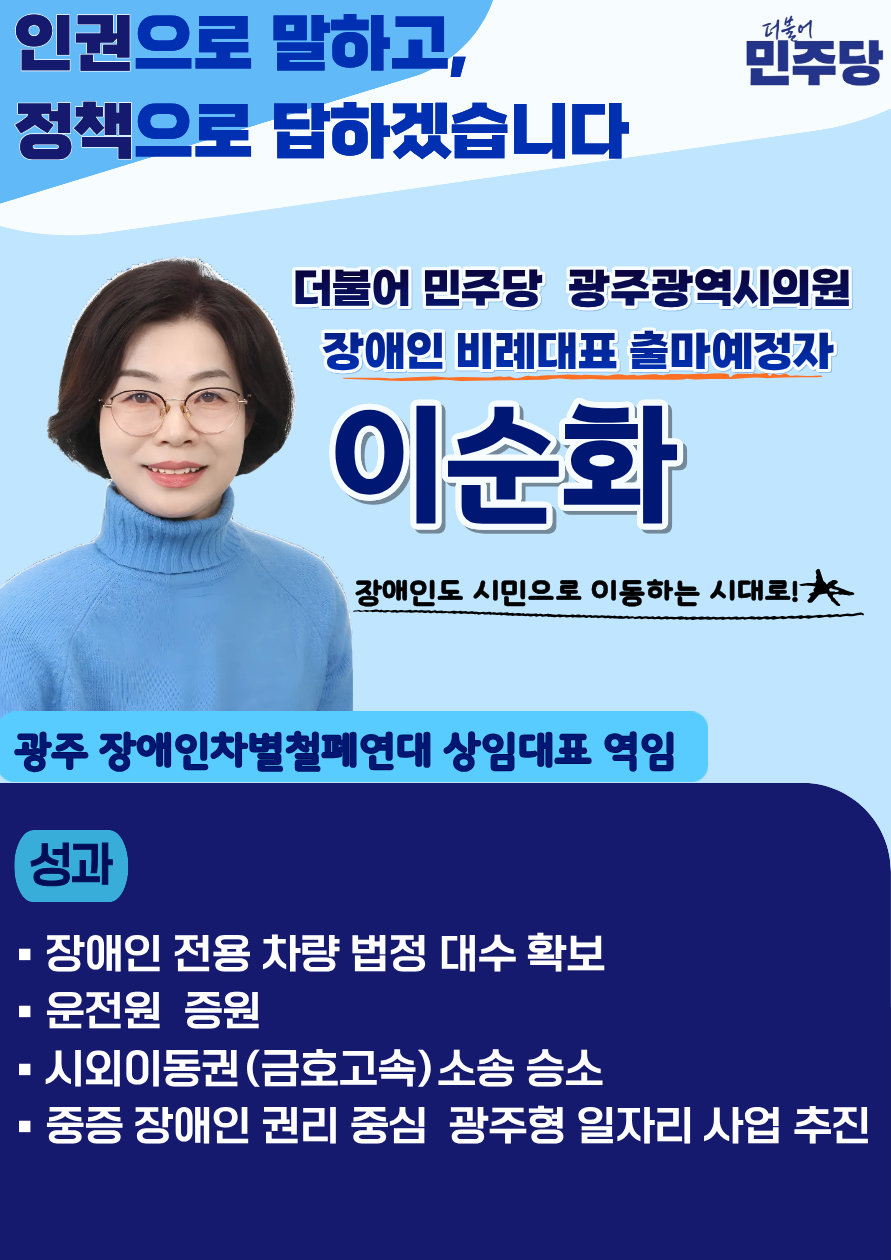 안녕하세요 작성자이순화|작성시간26.02.20|조회수54 목록 댓글 1 글자크기 작게가 글자크기 크게가 더불어 민주당 광주광역시의원 장애인 비례대표 출마예정자 이순화입니다 많은 관심 부탁드립니다 다음검색 현재 게시글 추가 기능 열기 북마크 공유하기 신고 센터로 신고 댓글 댓글 1 댓글쓰기 답글쓰기 댓글 리스트 작성자월산동미주맘94 | 작성시간 26.02.24 안녕하세요^^ 댓글 전체보기