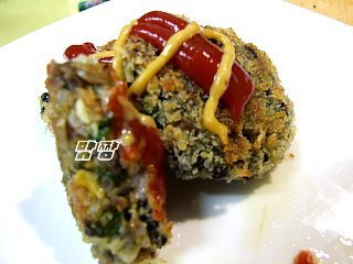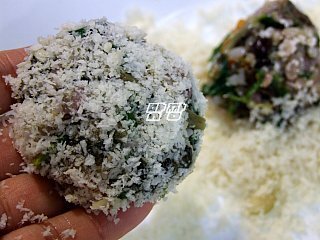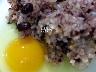 밥에 달걀을 넣고 비빈후에 나물과 다진 야채를 넣어 섞은 후에 찹쌀가루를 넣어준다.