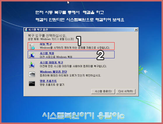 1번째 메뉴 시동복구를 먼저 선택을 해서 문제가 해결이 되는지를 확인을 하여보고 문제가 해결이 되지를 않는다면 시스템복원을 선택을 해서 문제를 해결 하도록 하세요!!!!