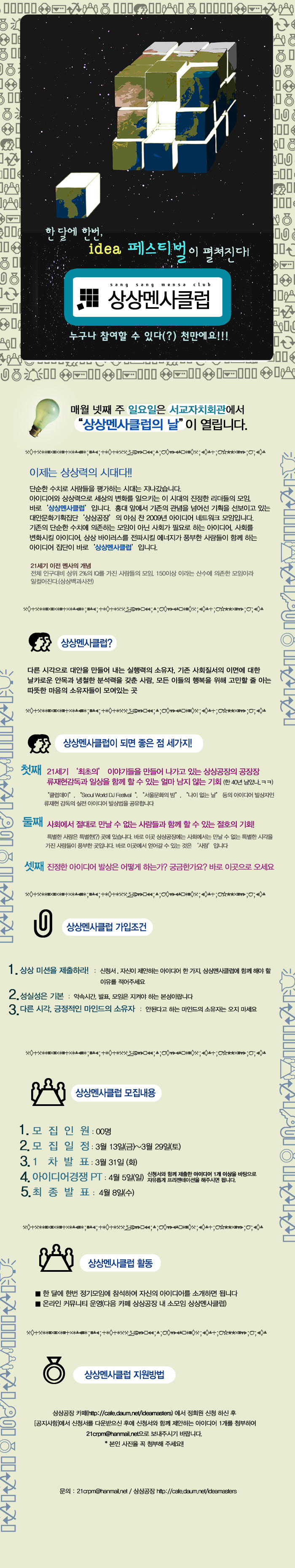 답댓글 작성자김주연-상상공장 작성자 본인 여부 작성자 작성시간 09.04.10 앞으로 정기적으로 상상멘사클럽 공지를 할 예정입니다. 다음 기획에 꼭 지원해주세요 ^^