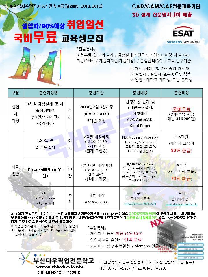 실업자 국비무료교육생 모집 작성자부산다우직업전문학교|작성시간14.01.21|조회수14 목록 댓글 0 글자크기 작게가 글자크기 크게가 실업자 3D CAD 국비무료 교육생을 모집합니다. 개강일 : 2014.2.3.(09:00~18:00) 접수방법:부산다우직업전문학교 홈페이지를 통하여 교육신청서 작성 다음검색 현재 게시글 추가 기능 열기 북마크 공유하기 신고 센터로 신고 댓글 댓글 0 댓글쓰기 답글쓰기 댓글 리스트
