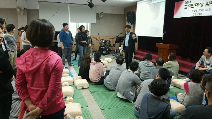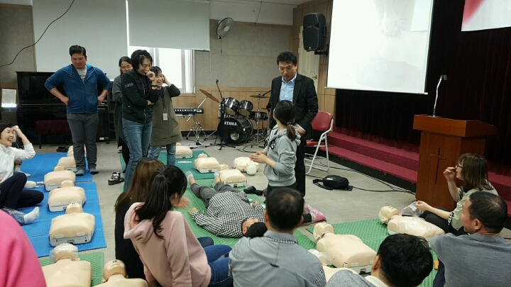 이론수업 후에는 애니를 이용한 가슴압박,인공호흡,의식확인 방법과 자동제세동기 사용법을 중심으로 한 실습교육이 이루어졌다.