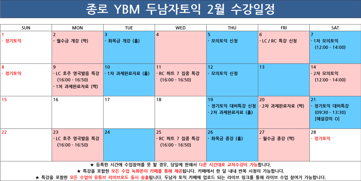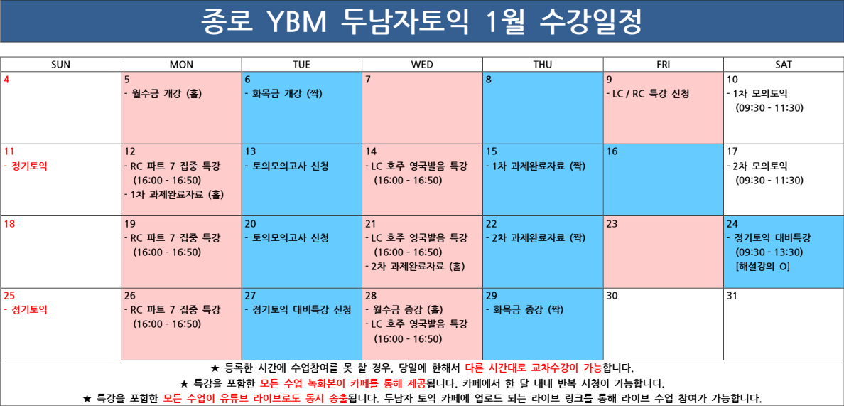 ※ 평일에 진행되는 LC 특강은 "호주, 영국발음 완전정복 특강"으로 진행되며 "RC 특강은 파트 7 집중 특강"으로 진행됩니다.