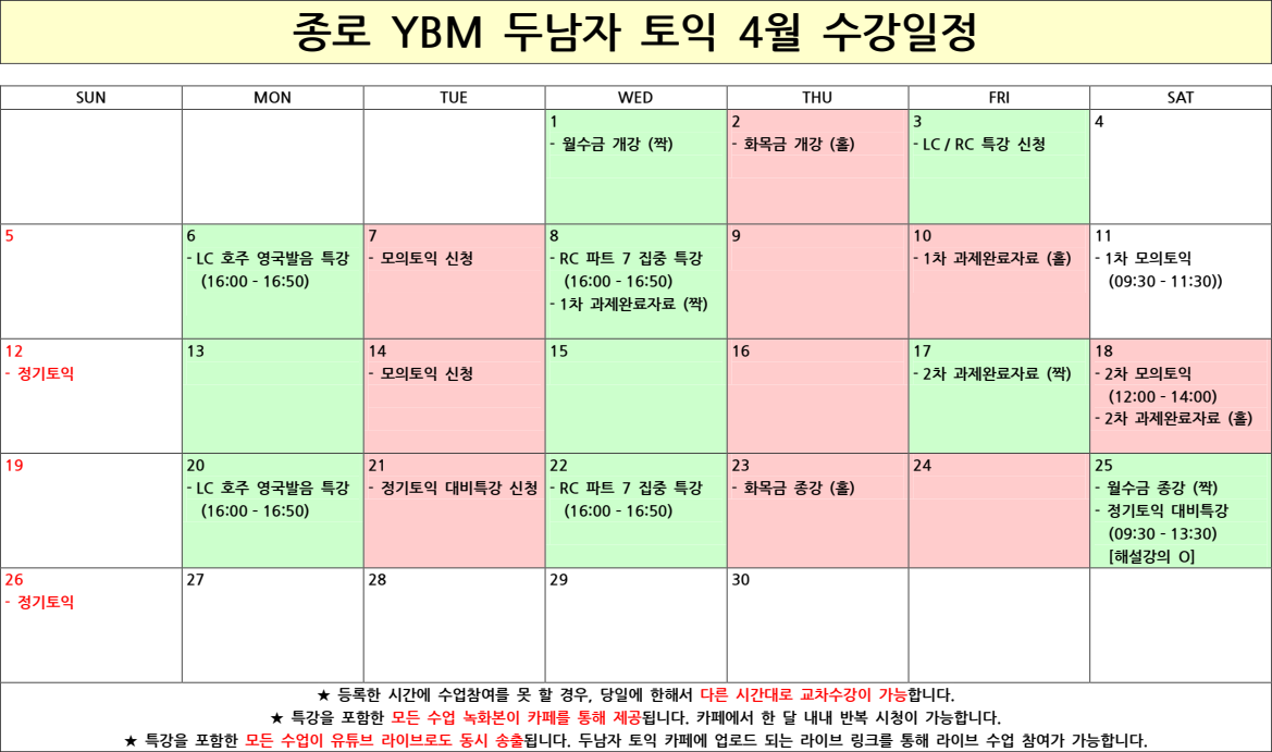 ※ 평일에 진행되는 LC 특강은 "호주, 영국발음 완전정복 특강"으로 진행되며 "RC 특강은 파트 7 집중 특강"으로 진행됩니다.